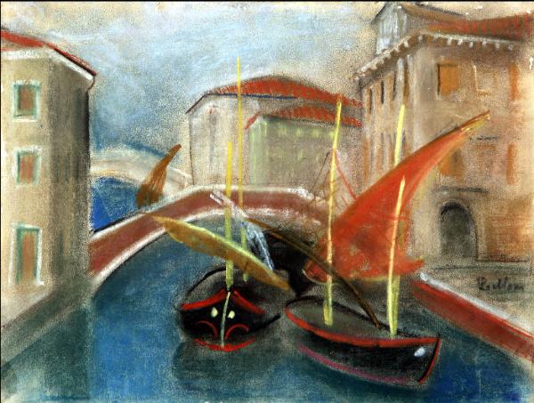 Opera che rappresenta una veduta della città di Chioggia. L'opera è tutta impostata sullo scorcio in prospettiva del corso d'acqua che entra nella città, chiuso ai lati dalle case. Sovrastano la distesa d'acqua cristallina due piccoli ponticelli ad arco, mentre navigano dolcemente sulla superficie marina tre imbarcazioni a vela molto colorate che occupano il primo piano della veduta. I colori, tenui e dai toni pastello regalano all'opera un'aspetto solare, luminoso, armonioso.