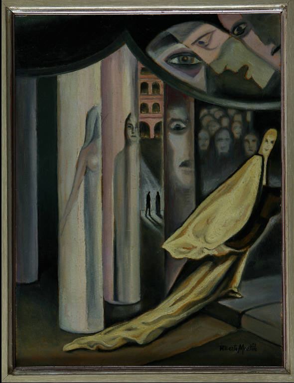 Opera che rappresenta una composizione d'invenzione, di carattere surrealista-metafisico e dal significato ambiguo. In una sorta di quinta teatrale appare, in primissimo piano sulla destra una figura umana, probabilemente femminile, vestita con una lunga veste e con un mantello gialli, che sembra scappare salendo dei gradini in pietra. La figura si volta indietro con uno sguardo sogghignante. Sempre in primo piano ma sulla sinistra dell'opera sono rappresentate delle colonne lisce, a tutto tondo, senza scanalature, sulle quali si riflettono due figure femminili e un volto spaventato caratterizzato da grandi occhi e dalla bocca spalancati. In secondo piano, dietro alle colonne, si trovano due figure umane nere e molto piccole che proiettano la loro ombra per terra essendo illuminate da un fascio di luce. Sullo sfondo s'intravede la parte di un palazzo caratterizzato da una facciata sulla quale si aprono numerose piccole finestre scure. Dietro alla figura vestita di giallo, si trova una moltitudine di volti dalle espressioni misteriose e inquietanti. Una sorta di velario ricopre la scena e all'interno di una delle sue "pieghe" sono rappresentati tre visi spaventati: due osservano la scena sottostante, il terzo, di cui si vede solo un occhio, guarda verso l'osservatore.