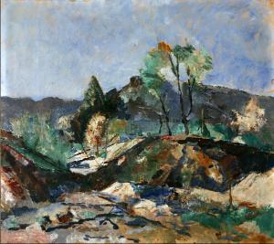 Opera che rappresenta un paesaggio con alberi e cava di pietra. Quest'ultima è la vera protagonista dell'opera in quanto compare in primo piano: la terra e le pietre spiccano per il colorito bruno e bruciato dal sole che riflette sulle pietre l'ombra degli alberi, sottili e spogli. Radi cespugli verdi crescono tra le rocce. Sullo sfondo si staglia il profilo delle montagne. Il cielo è limpido. Tutta l'opera è resa con pennellate veloci; la tavolozza usata è minima ma l'insieme risulta ben proporzionato e ricco di contrasti luce-ombra.