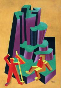 Opera che rappresenta una composizione d'invenzione rappresentante un'altura, forse un'architettura o un'altura realizzata in modo tridimensionale. Ai piedi di questa costruzione ci sono due figure, una in piedi con in mano un bastone e l'altra seduta. La particolarità di queste figure è che sono anch'esse realizzate in modo tridimensionale, rigido e stilizzato. Sono figure spigolose, volumetriche, prive della morbidezza e delle curve di un comune corpo umano. I colori sono sgargianti, carichi e l'opera è ricca di sfumature che aiutano a creare la profondità e i volumi delle forme rappresentate.