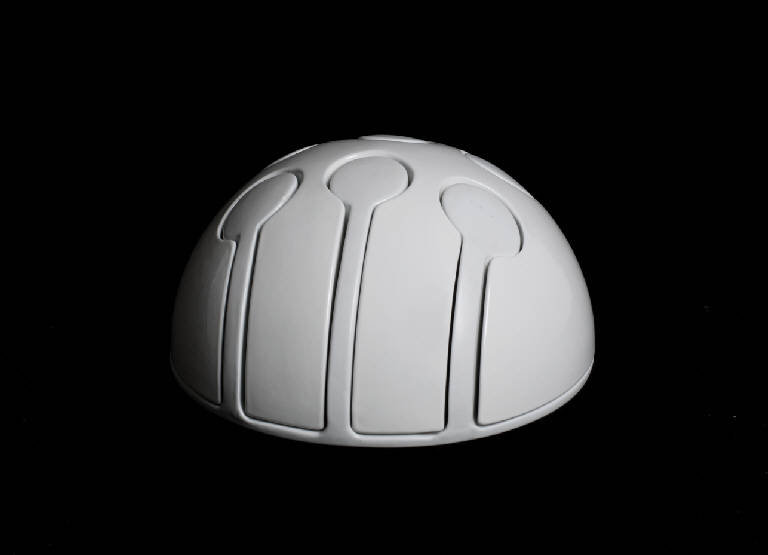 Scultura in terraglia invetriata di colore bianco composta da due pezzi semisferici ad incastro. Il primo pezzo presenta una base tonda dalla quale partono sei elementi verticali con terminazioni tonde sui quali si incastra la calotta semisferica del secondo pezzo, aperta appunto in sei punti. L'intera superficie della scultura è completamente liscia e priva di decorazioni.