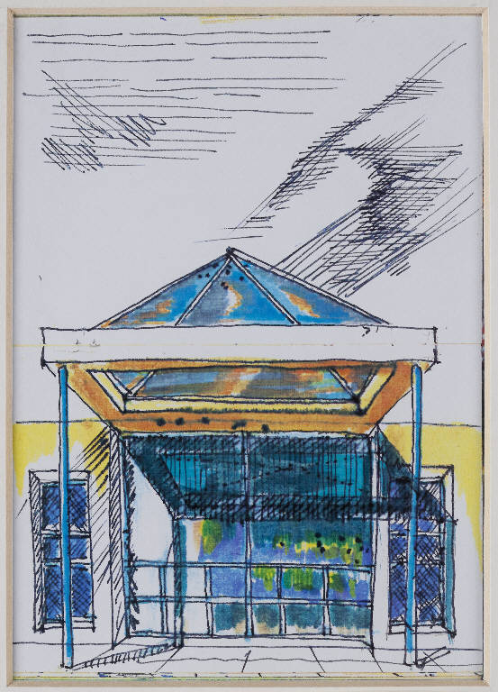 Disegno rappresentante in primo piano l'entrata di un edificio preceduto da una sorta di porticato coperto. Il tetto del piccolo portico è a piramide a base quadrata. Il portico prevede quattro sottili colonne lisce di colore azzurro mentre il cornicione interno del tetto è di colore arancione e giallo. Il tetto del portico è vetrato in quanto nel disegno è colorato con varie tonalità di grigio e di azzurro per richiamare la superficie riflettente del vetro. Dell'edificio cui il portico immette si vedono solamente una porta finestra vetrata con ai lati due finestre alte e strette.
