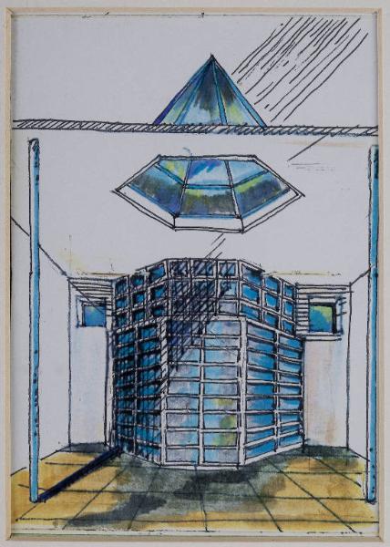 Disegno che rappresenta un interno. Il particolare più importante di questo interno è il lucernario a forma piramidale tutto in vetro. Sono anche tracciate delle linee a matita diagonali che rappresentano la luce che attraversa il vetro.\nInoltre, al centro della stanza e addossata alla parete di fondo vi è una struttira archiettonica di tre lati in prospettiva, interamente composta da piccoli rettangoli di vetro. Sulla parete di fondo si intravede anche una finsetra orizzontale lunga e stretta.\nIl pavimento della stanza è anch'esso disegnato in prospettiva ed è piastrellato con piasterelle di colore marrone chiaro. In primo piano si vedono rispettivamente a destra e a sinistra una coloninna portante di colore azzurro.