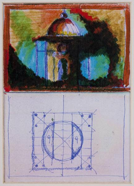 Disegno suddiviso in due parti orizzontalmente: nella parte alta, è rappresentato tridimensionalmente e in prospettiva un tempietto a cupola circondato da esili colonne. Il tempietto è colorato con tonalità scure di giallo, verde e rosso. Il cielo di sfondo è dipinto anch'esso con queste tinte un po' innaturali e cupe.\nLa parte inferiore del foglio, invece, vede uno schizzo della pianta del tempietto a pianta circolare, realizzata con inchiostro blu.