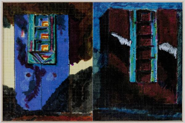 Disegno formato orizzontale diviso in due parti verticalmente. Entrambe le parti vedono rappresentata la lo schizzo, molto colorato, della facciata di un edificio. Tutti e due le facciate sono caratterizzate, oltre che dai colori forti e sgargianti, da una finestra centrale verticale, lunga e stretta.\nLa facciata dell'edificio di sinistra è di colore viola; quella dell'edificio destra è a macchie bordeaux.