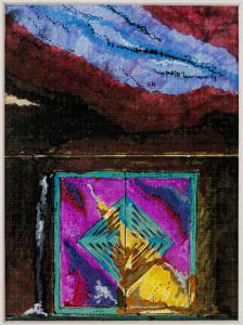 Disegno rappresentante lo schizzo di una finestra quadrata disegnata in primissimo piano. La finestra è colorata di fucsia e presenta all'interno un vetro azzurro a forma di rombo. Inoltre è contornata da un profilo color verde acqua.\nTutto il disegno è caratterizzato da colori forti, intensi, sgargianti.