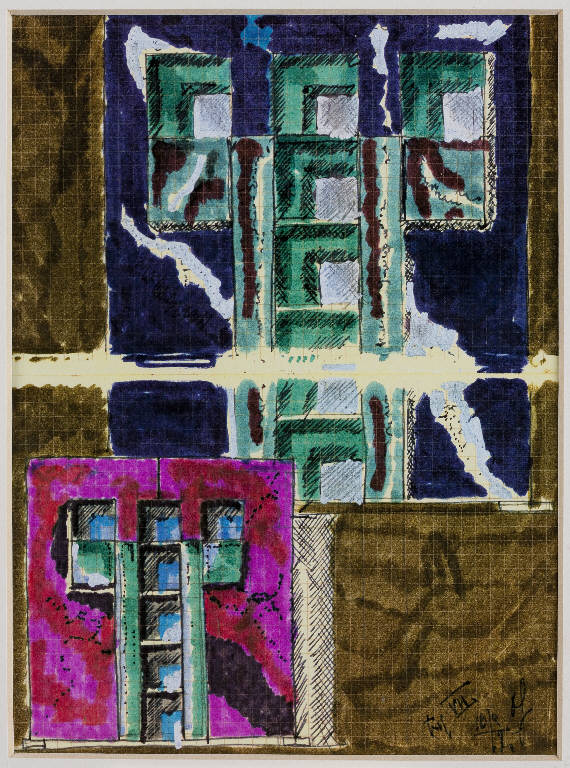 Disegno rappresentante la facciata di un edificio. Il disegno è molto colorato, talmente tanto da far fatica ad inviduare gli elementi architettonici della facciata e i loro particolari. Si definisccono sicuramente almeno due finestre vetrate.\nI colori sono sgargianti, brillanti, molto forti: vanno dai toni del fucsia acceso,dal marrone al viola al blu.