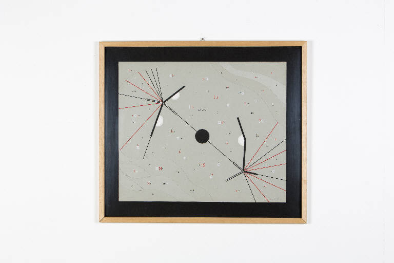 L'opera è un collage di linee rette e cerchi che si irradiano su uno sfondo di lettere sparse. I colori utilizzati sono tre: rosso, nero e bianco.