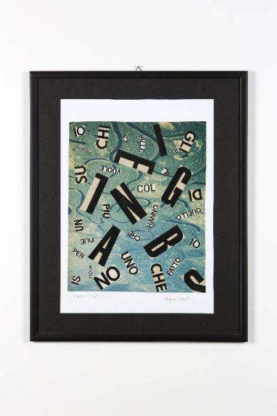 L'opera è costituita da un insieme di parole e lettere in ordine sparrso e di grandezze diverse su lo sfondo azzurro dell'acqua.