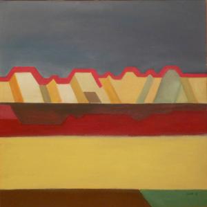 Tela dipinta a composizione geometrica a fasce. La fascia centrale è caratterizzata da inserti verticali obliqui di colori diversi. La fascia soprastante è interamente blu. Le tre fasce sottostanti, orizzontali e di colori diversi, occupano la metà inferiore del dipinto. Colori (dall'alto): blu, rosso, beige, rosso, giallo chiaro, marrone e verde.
