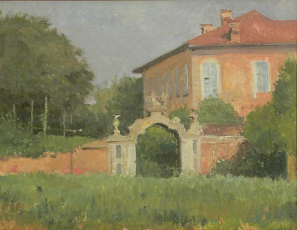 Veduta di una villa circondata da un grande parco, cinta da un'elegante muraglia con cancello. Le tonalità usate sono calde e piene e i colori vanno dalla tonalità pesca della villa ai diversi verdi del parco antistante.