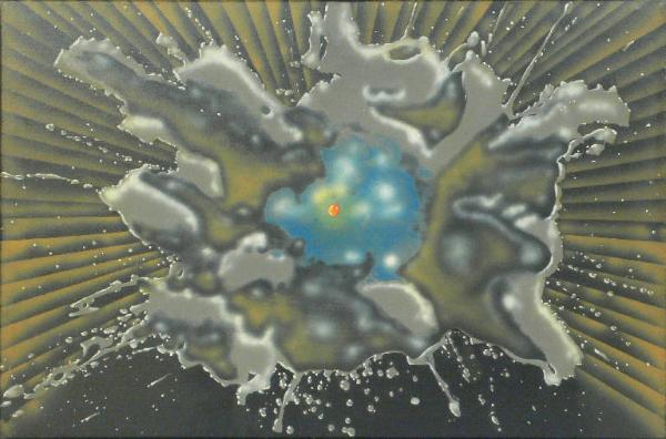 La composizione astratta parte da un punto centrale rosso, raffigurato come una goccia densa di colore. Attorno a questa si allargano concentricamente delle macchie di colore, prima verdi, blu e bianche, poi verdi e grigie. A chiusura troviamo dei raggi neri, verdi e grigi che si irradiano fino a chiudere la composizione, eccetto che per la parte bassa della tela che rimane completamente nera, come vuota.