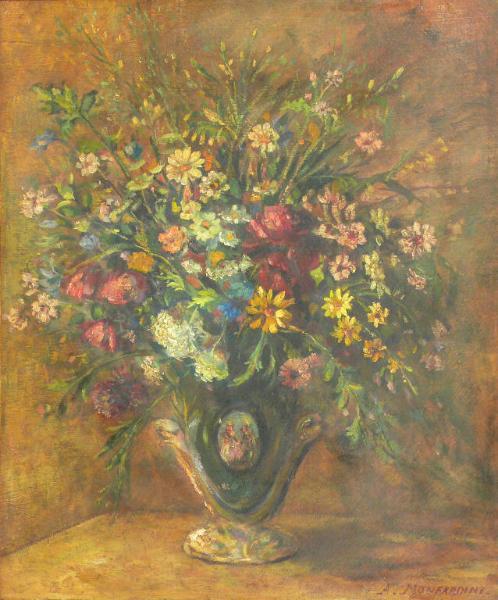 Natura morta raffigurante un vaso di fiori di campo. Il vaso presenta un ovale dipinto con due figure nel centro. Il fondo è nelle tonalità del beige e del marrone.