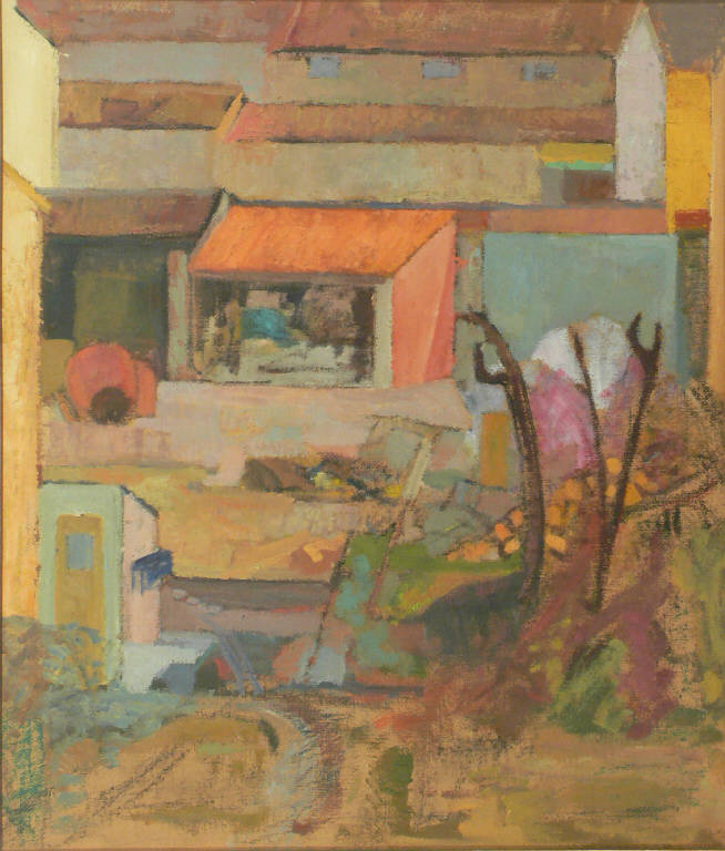 In primo piano tronchi di alberi e oggetti disparati accatastati disordinatamente e resi in maniera approssimativa, sullo sfondo costruzioni rurali. Il dipinto è connotato dal tono grigio, qualche tocco caldo e dal verde della vegetazione
