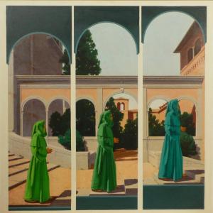 Chiostro, con scalinate ai lati, chiuso da una successione di archi a tutto sesto su esili colonne; ai lati due pareti di edifici: a sinistra di colore grigio, a destra con mattoni, cornice ad archetti e sormontato da una bifora. Oltre alle arcate si vede un giardino interno con piante rigogliose ed un basso campanile adiacente ad un altro più basso. Il primo piano è diviso in tre parti da linee verticali bianche e tre archi in scorcio, sotto ogni arco è ritratto un monaco scalzo in preghiera con mani giunte ed il piede sinistro avanzato, la veste cinta in vita e con cappuccio alzato, in tre diversi toni di verde