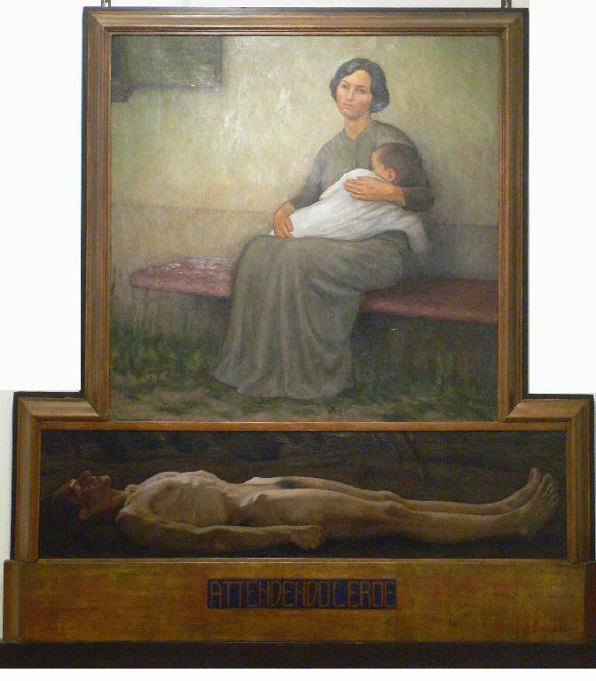 Opera coposta da due parti. Nella parte superiore viene raffigurata una giovane donna seduta su di una panca che indossa un lungo abito grigio e ha un bambino, dalla lunga camicia bianca che la abbraccia,in grembo. Sotto la panca si vede il verde dell'erba, mentre alle spalle della donna si nota il muro con la fascia inferiore leggermente più scura e a destra si vede un angolo di un'imposta di legno. Nella parte inferiore viene ritratto un uomo nudo, in posizione supina, magro e con i capelli grigi, sullo sfondo scuro si notano parti di vegetazione.