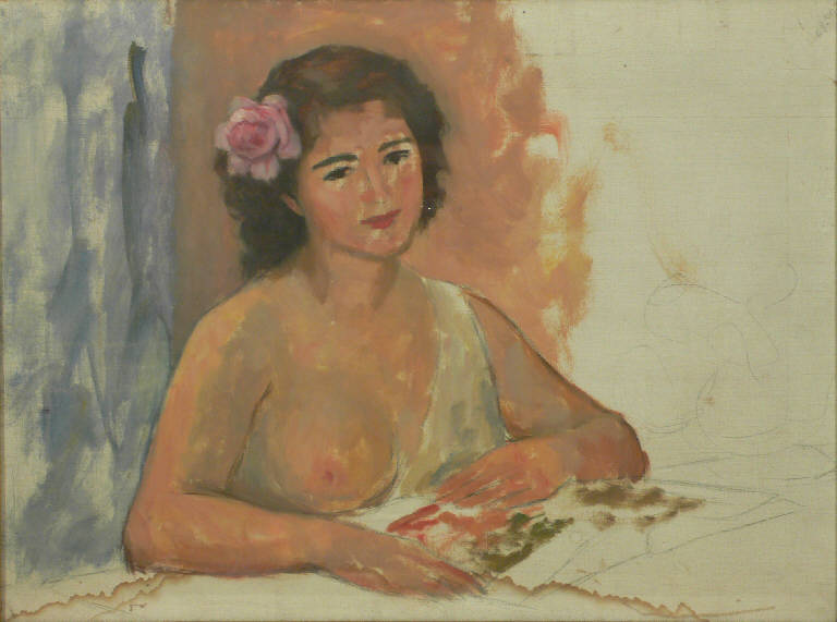 Una fanciulla dalla capigliatura castano scuro con una rosa appuntata tra i capelli siede ad un tavolo su cui appoggia le mani; un seno nudo, l'altro coperto da una veste trattenuta sulla spalla corrispondente; gli occhi neri e le labbra rosse. Il volto è terminato, il resto del corpo è stato abbandonato in fase di elaborazione; un banda verticale azzurra a sinistra e lo sfondo ocra non sono stati terminati.
