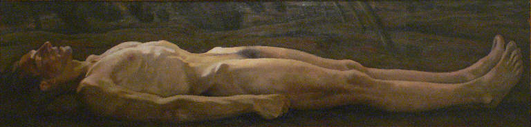 Ritratto di un uomo nudo, in posizione supina, magro e con i capelli grigi. Sullo sfondo scuro si notano parti di vegetazione.