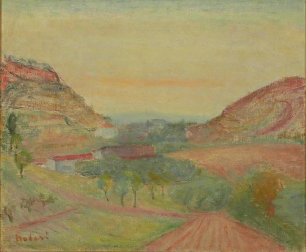 Paesaggio delle colline moreniche con al centro una distesa di campi coltivati, una strada ed alcune case dal tetto. Sullo sfondo si scorge il lago di Garda. Il cielo è nei toni del rosa, dell'arancione e dell'azzurro.