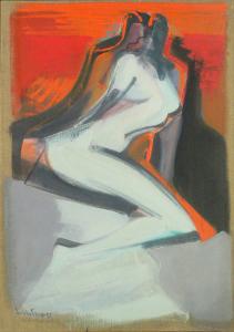 Figura di donna stilizzata ritratta con le gambe piegate e di profilo. I tratti somatici non sono delineati. La figura è bianca con profili neri ed arancio. Lo sfondo è nei toni del rosso e dell'arancione mentre la parte inferiore è grigia.