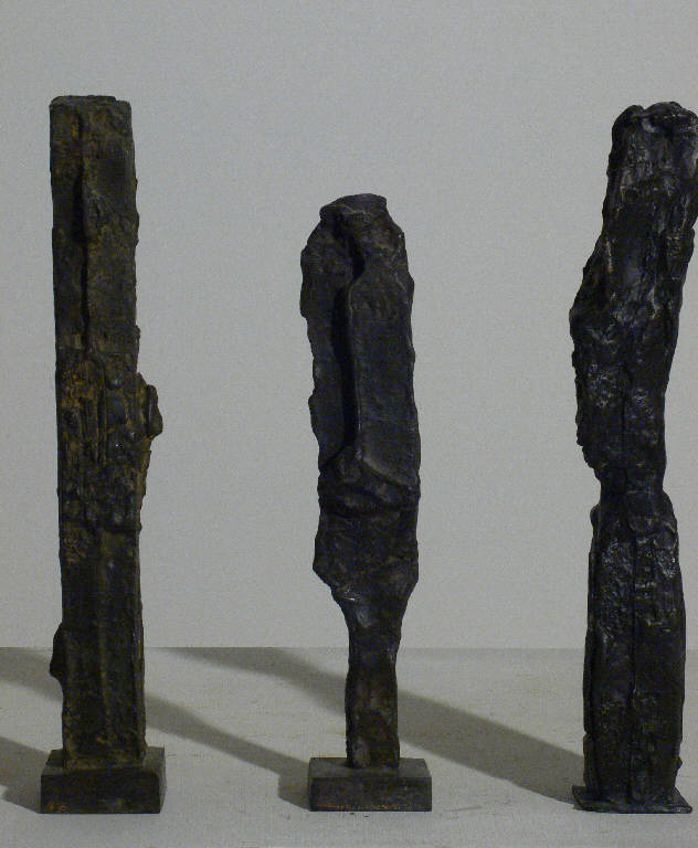 Composizione di tre sculture dallo sviluppo verticale. La figura 1 è a forma di parallelepipedo, la figura 2 ha uno stelo sottile che sostiene una parte sovrastante più grande caratterizzata da una protuberanza verticale nel centro, la figura 3 presenta uno strozzamento che la divide a metà.