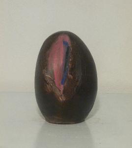 Scultura dalla forma ovoidale che presenta una pennellata di colore rosa e blu al centro.