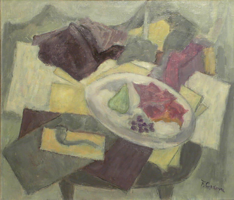 Natura morta composta da un tavolino sul quale sono appoggiati dei fogli, una pipa, un piatto contenente uva, una pera ed una conchiglia. La composizione è nei colori del giallo, bianco, nei toni del grigio e del viola.