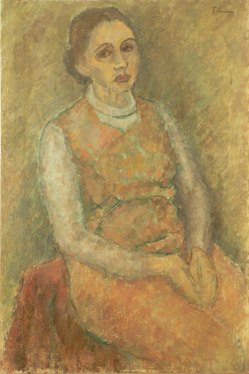 Ritratto di donna seduta. La donna ha capelli castani raccolti, indossa un abito smanicato rosa con maglia a manica lunga bianca. Le mani sono giunte appoggiate sulle gambe. Lo sfondo è nei toni del marrone e grigio.