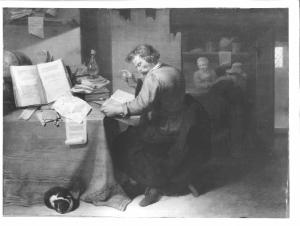L'alchimista. Figura di alchimista in lettura all'interno del suo laboratorio