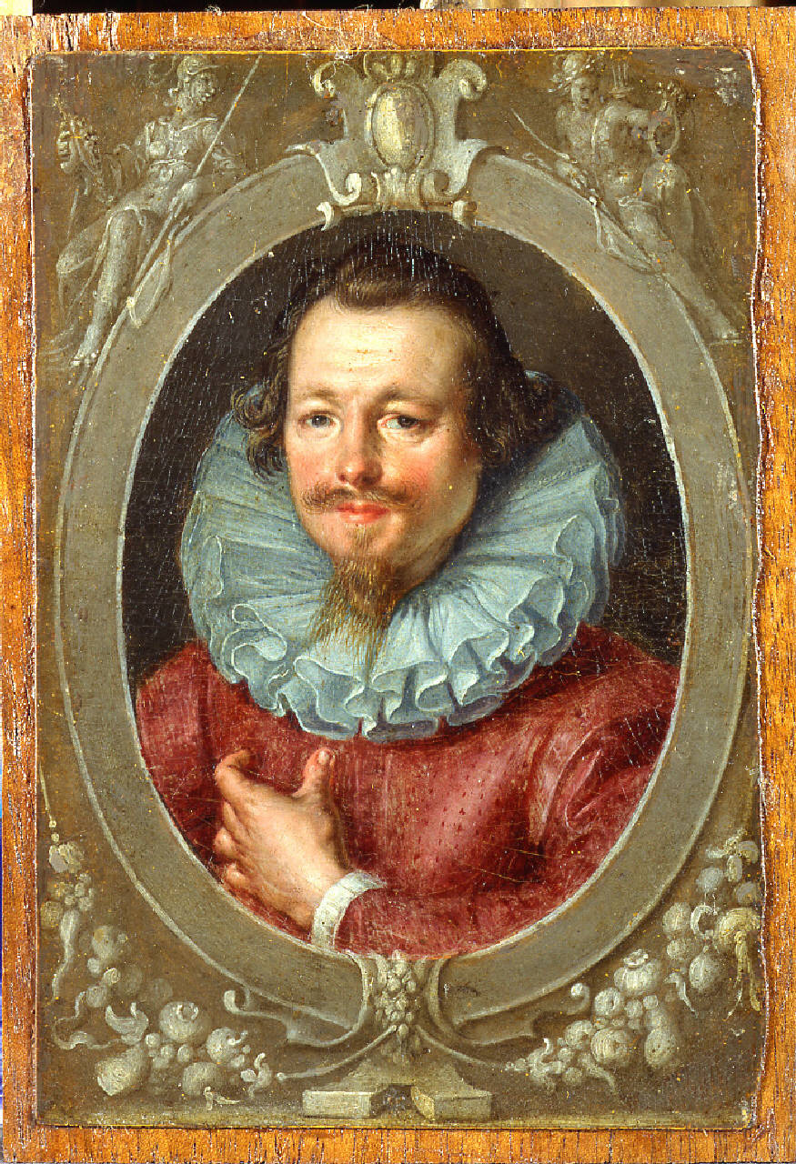 - NOTIZIE STORICO CRITICHE Questo quadretto e il suo pendant (inv. n. 1282) erano attribuiti a Hendrick Goltzius nel catalogo manoscritto Belgiojoso. Essi sono stati invece riconosciuti come opere di Joachim Wtewael, un protagonista del tardo manierismo olandese a Utrecht. Sempre nel catalogo Belgiojoso, l'effigiato era qui identificato in Alessandro Farnese; trattasi invece di Johan de Witt (figlio di Steven) che fu canonico della chiesa di Santa Maria a Utrecht e scrittore. I suoi interessi umanistici sono espressi nelle figure di Atena e Apollo, in alto, nel bordo a grisaille. Fu probabilmente lo stesso Johan a commissionare questi due quadretti a Wtewael - che era loro lontano parente - molto tempo dopo la morte del padre (1570); mentre per il ritratto del padre, realizzato post-mortem, il pittore ha dovuto utilizzare un modello sconosciuto, la maggior vivacità del ritratto di Johan suggerisce un'esecuzione dal vero. Probabilmente la concezione formale iconografica di questa coppia di ritratti si rifà a quelli di Julius e Joseph Scaliger, incisi da Goltzius nel 1592 (Strauss 1977, nn. 319, 320, figg. 44, 45). Lowenthal (1975 e 1986) propone per questa coppia di ritratti una datazione tra il 1604 e il 1610, cronologia confermata anche dai caratteri stilistici che impongono comunque di non andare oltre il primo decennio del Seicento.