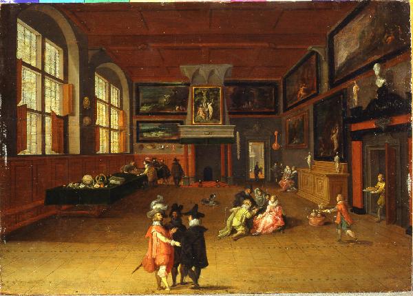 - NOTIZIE STORICO CRITICHE L'opera appartiene al genere delle gallerie dipinte sviluppatosi ad Anversa a iniziare dai primi decenni del Seicento: rappresentazioni di una o più sale decorate con quadri, statue, "naturalia" e altre "rariora". Le opere d'arte sono talora identificabili, ma soltanto in qualche caso si tratta di collezioni veramente esistite (sull'argomento cfr. Speth Holterhoff 1957 e Filipczak 1987, pp. 47-72). Nel catalogo manoscritto della collezione Belgiojoso il quadro è menzionato sotto i nomi di "Francken, Van Delen o Van Bassen". Ed è in effetti a Frans Francken II, autore di questo genere di dipinti, che il quadro si rivela stilisticamente molto affine, per quanto l'esecuzione sia, rispetto alle opere del maestro, di qualità meno elevata e più sommaria. Sono individuabili corrispondenze con figure dipinte dal figlio Frans Francken III (1607-1671), noto solo come autore di piccole figure in alcuni interni di chiesa di Pieter Neefs I e II e Lodewijck Neefs (sui Francken cfr. Harting 1983, figg. 106-108). Il dipinto del Castello è da collocarsi nell'immediata cerchia di Frans Francken II e potrebbe forse essere la ripetizione di un suo lavoro di maggiori dimensioni.