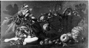 Natura morta con cesto di paglia, frutti e vegetali. Natura morta con frutta e vegetali