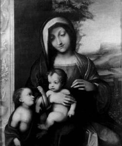 - NOTIZIE STORICO CRITICHE Entra nel patrimonio delle Civiche Raccolte Milanesi nel 1865, l'opera è nota come "Madonna Bolognini". Il dipinto viene acquistato da Pio Innocenzo Attendolo Bolognini l'8 dicembre 1844 presso Giacomo Cassani suo abituale fornitore d'arte come opera di Cesare da Sesto e valutato 1900 lire. La Madonna era appartenuta in precedenza era appartenuta al signor Landriani, identificabile in Paolo, scenografo della Scala e Accademico di Brera. Non si conosce la storia precedente dell'opera. Dopo la morte di Pio Innocenzo pervenne al fratello Gian Giacomo e quindi incluso nel legato del 1865. Temporaneamente depositato presso l'Ambrosiana rientra nel Museo nel 1900. L'attribuzione all'Allegri si deve al Frizzoni (Meyer, 1871, p. 79), mai messa in dubbio dagli studi successivi anche in assenza di prove storico documentarie. Riguardo la datazione si è concordi nel ritenere l'opera giovanile. Il Corpus delle opere giovanili di Correggio è ricostruito attorno all'unica opera datata con certezza, la "Pala di San Francesco", oggi a Dresda alla Gemaldegalerie del 1514. Prossime a questa sono ritenute la "Madonna Bolognini", la "Sacra Famiglia con San Giovannino" di Los Angeles, la "Sacra Famiglia con Santi Giovannino ed Elisabetta" della "Pinacoteca Malaspina" di Pavia e la "Madonna con Bambino e San Giovannino" della Galleria Borghese di Roma. L'affinità tra queste opere è stata messa in luce già nella mostra di Parma del 1935. Nella Madonna Bolognini la critica recente riconosce un forte influsso leonardesco nella profonda fusione tra figure e paesaggio. Il Modello compositivo è stato identificato da Brown nella "Madonna dei fusi" (1972, pp. 7-33). Non è però nota l'occasione di conoscenza della pittura di Leonardo da parte di Correggio. Gli echi raffaelleschi individuati nella Madonna Bolognini sono ritenuti piuttosto vaghi. Mentre a questa data sono ritenuti più forti gli echi della pittura veneta, da Lotto a Bellini a Giorgione, che sarebbero evidenti nella luce metallica che avvolge la Madonna nella spalla destra. La prossimità cronologica con la Pala di San Francesco di Dresda sarebbe inoltre confermata dall'analoga funzione assegnata alla quinta architettonica sulla sinistra che crea una direttrice spaziale. Echi leonardeschi sono stati colti anche nel gesto della mano sinistra della Madonna, atto di protezione intriso di partecipazione emotiva. (Cavalieri, 1997)