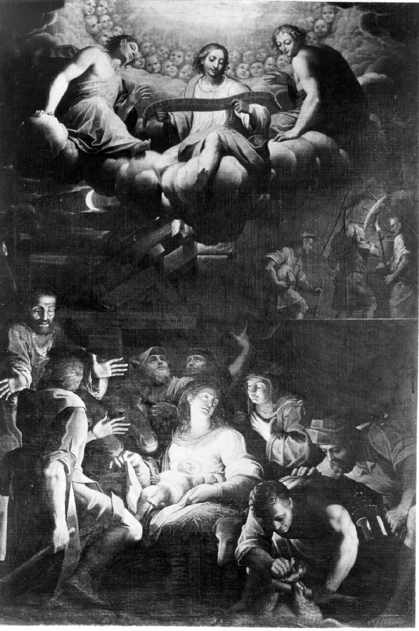 - NOTIZIE STORICO CRITICHE "...In origine l'ancona si trovava a Lodi nel convento delle Cappuccine e venne acquistata dal vescovo Salvatore Andreani (...). L'informazione mi è stata cordialmente segnalata da Federico Cavalieri e da Mario Comincini che stanno curando la pubblicazione del manoscritto... dove vengono riassunte le vicende della pala dopo la soppressione del convento nel 1782..." in L. Basso, Inventari della famiglia Sormani. Parte seconda, in "Libri & Documenti", XXXII-XXXIII, 2006-2007, Archivio Storico e Biblioteca Trivulziana, Castello Sforzesco, Milano 2009, pp. 85-117, nota 27 a p. 108.\n"Sotto il nome "Pansa", erronea ripetizione della stringa precedente, si cela l'Adorazione dei pastori con Santa Chiara e San Francesco d'Assisi di Giovan Battista Trotti detto Malosso (inv. 921), giunto in Pinacoteca ..." in L. Basso, Inventari della famiglia Sormani. Terza e ultima parte., in "Libri & Documenti", XXXIV-XXXV, 2008-2009, Archivio Storico e Biblioteca Trivulziana, Castello Sforzesco, Milano, 2010, pp. 159-192, nota 71 p. 185.
