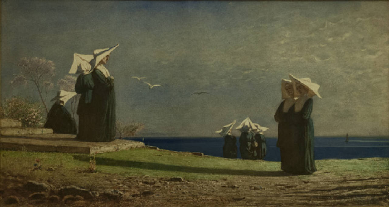 Monachine in riva al mare. marina con figure, alberi e barca