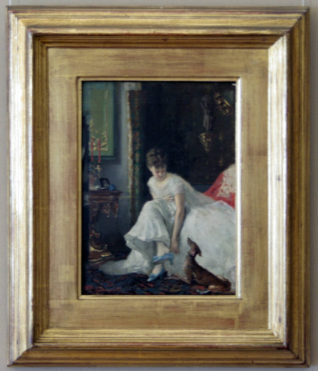 Signora in bianco. interno con giovane donna e cane
