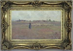 La paix du soir. paesaggio con donna e gregge di pecore