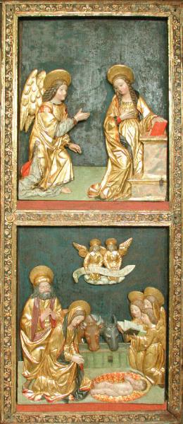 Anta di polittico dipinta sul fronte con la raffigurazione dell'"Angelo annunciante" e intagliata, dipinta e dorata sul verso con le scene dell'"Annunciazione" e della "Natività di Gesù Bambino" entro due scomparti sovrapposti, delimitati da una cornice a racemi vegetali in rilievo.