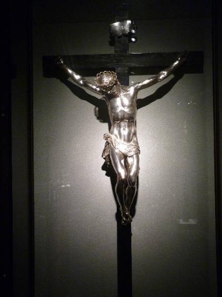 - NOTIZIE STORICO CRITICHE Questo prezioso crocifisso in argento a fusione era utilizzato nelle solennità sopra l'altare maggiore e nelle processioni dei canonici (Calvi). Le notizia documentarie e bibliografiche, che talora ripetono senza verifica precedenti note, sono un po' contraddittorie (per un resoconto cfr. Il Tesoro del Duomo..., 1989, p. 46 e Pagnoni, 1991, pp. 128-130) e attribuiscono la donazione del Crocifisso alternativamente al vescovo Luigi Cornaro (1560-1561) o al fratello Federico, anch'egli vescovo di Bergamo (1561-1577). Le fonti più antiche, quali il canonico G.B. Moiolo (1617), una nota vagante dell'archivio capitolare della Diocesi e l'inventario post 1593 sono, tuttavia, concordi nel riferire il lascito al cardinale Fedrico Cornaro. In particolare quest'ultimo inventario riferisce dettagliate notizie che paiono attendibili: "Un crocifisso grande d'argento donato dall'Ill.mo Cornaro Federico cardinale ... l'anno 1592 fu mandato da Roma et ivi consegnato all'Ecc.te G. Andrea Beroa". Sia per tipologia che per stile il crocifisso in oggetto è stato riferito alla bottega di Jean de Boulogne, celebre scultore franco-fiammingo nato nell'Artois e a lungo attivo in Italia con il nome di Giambologna. Dello scultore sono noti 13 crocifissi da lui realizzati e fusi dagli argentieri Egidio Leggi e soprattutto Antonio Susini (1550/55-1624), attivi presso il suo atelier. Poiché Federico Cornaro nel 1586 passò da Firenze per una missione diplomatica su incarico pontificio, non è improbabile che abbia acquistato in questa occasione la pregiata scultura.