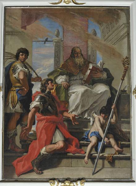 - NOTIZIE STORICO CRITICHE Dopo che nel 1575 le reliquie dei Santi Procolo, Fermo e Rustico furono traslate in Duomo dal convento di San Fermo a Plorzano, furono depositate in un primo momento presso l'altare maggiore, poi presso quello di San Carlo e dal 1699 in un altare provvisorio collocato in testa al transetto destro, in attesa della costruzione di un'adeguata struttura che fu messa in opera su disegno di Filippo Juvarra solo a partire dal 1731. Per dare decoro all'altare posticcio, interpretando il desiderio dei fedeli, nel 1704 il canonico Pietro Negroni incaricò di una vera e propria pala dedicata ai tre Santi il già affermato pittore bellunese Sebastiano Ricci, attivo in varie città italiane e reduce da un viaggio a Vienna. L'opera, che con la costruzione dell'altare juvarriano fu spostata sulla parete laterale, è considerata dalla critica come un punto di svolta nella produzione del pittore che si libera definitivamente della tradizione barocca con la sua eredità chiaroscurale e drammatica. Innovativi sono l'uso del colore schiarito, intriso di luce solare e steso in larghe campiture, e la composizione semplificata con figure accostate senza sovrapposizioni e dall'andamento ritmico. Il dipinto di Bergamo è una tappa significativa di un percorso stilistico che troverà pieno compimento nel ciclo di Palazzo Marucelli a Firenze nel 1706-1707.