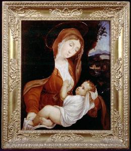 - NOTIZIE STORICO CRITICHE L'opera proviene dalla collezione di mons. Giuseppe Battaglia, che fu vescovo della Diocesi di Faenza-Modigliana dal 1944 al 1976. Presumibilmente alla sua morte, avvenuta nel 1984, l'opera pervenne a Bergamo, sua diocesi di origine. L'opera, già in collezione Rogni, è una replica del dipinto conservato all'Accademia Carrara (inv. 81LC00171), appartenente al fondo Lochis e databile al 1520. L'attribuzione ad Andrea Previtali, confermata oralmente al vescovo da Locatelli Milesi, Roberto Longhi e Mauro Pellicioli, è ribadita nello studio di I. Chiappini, che data l'opera a dopo il rientro del Previtali a Bergamo dal soggiorno veneziano, rientro databile al 1512. Il volto della Madre, lievemente inclinato, con gli occhi abbassati e con la bocca chiusa in atteggiamento pensoso, è quasi identico, seppur disposto specularmente, a quello presente nella "Madonna col Bambino tra San Giuseppe e Santo Stefano", conservata in collezione privata romana ma proveniente da Bergamo, che è stata datata da M. Lucco al 1513 ca. (in Bergamo. L'altra Venezia. 2001). Tra questa e la versione della Carrara, caratterizzata da una maggiore luminosità nel paesaggio e da un addolcimento della fisionomia della Madonna, è difficile stabililire l'esatto rapporto di dipendenza.