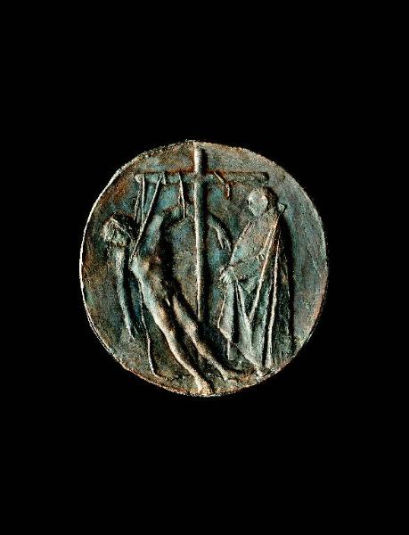 - NOTIZIE STORICO CRITICHE L'opera fa parte di una serie di tre medaglie donate nel 1949 dall'autore Giacomo Manzù al vescovo di Bergamo Adriano Bernareggi. Realizzate nel 1948, erano state esposte alla XXIV Biennale di Venezia dello stesso anno. La scelta di trattare un tema sacro ad alto contenuto drammatico come quello della "Passione di Cristo", già affrontato dall'artista negli anni '30 e '40, derivava dalla volontà del Manzù di denunciare gli orrori della Seconda Guerra Mondiale. L'artista attualizzò i soggetti sacri inserendovi oggetti e personaggi ripresi dal mondo contemporaneo, come la sedia-trono del Cristo deriso e la figura di vescovo modernamente abbigliato presente sia ai piedi della croce nella Deposizione che di fronte al corpo di Cristo morto nella Pietà. Le opere, che si collocano in un particolare momento di maturazione del linguaggio dell'artista, evidenziano il passaggio da un modellato morbido a forme energicamente definite da pochi e profondi solchi. Manzù affrontò nuovamente il tema della Passione di Cristo nel dopoguerra, facendone una sorta di schema meditativo sulla condizione umana.