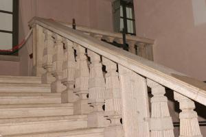 Balaustrata di scalone dalla forma a piramide scanalata con fascia liscia al centro.