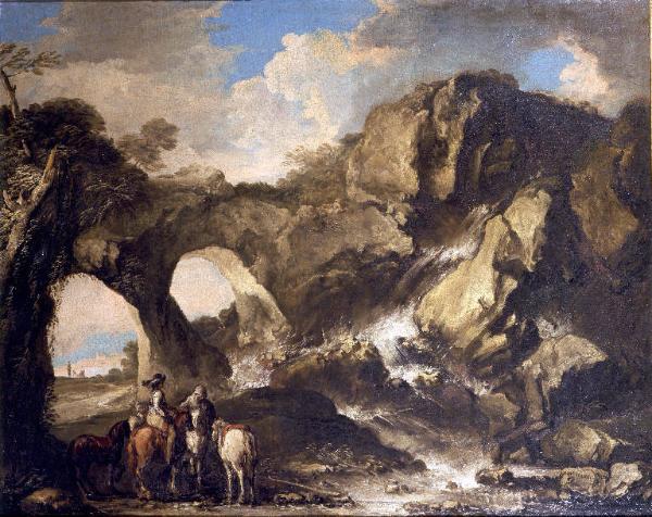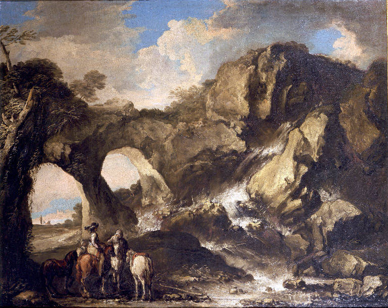 - NOTIZIE STORICO CRITICHE Spetta a R. Bassi Rathgeb il merito di aver scoperto la firma sul masso roccioso in basso a destra. Il medesimo schema compositivo è riscontrabile in "Paesaggio con arco naturale a cavalieri" (Padova, Museo Civico), "Paesaggio con figure e arco roccioso" (passato in asta presso Sotheby's, New York, 2003, lotto 181) e "Paesaggio con rupi, figure e case sullo sfondo" (Bergamo, Accademia Carrara, num. inv. DIS00570).