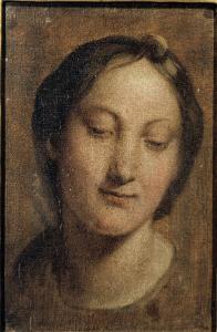 - NOTIZIE STORICO CRITICHE Tradizionalmente ritenuto un volto della Madonna. Si tratta del bozzetto parziale della "Madonna con Bambino in trono tra San Domenico, Santa Marta, Santa Caterina da Siena, Santa Maria Maddalena e angeli" dipinto dal Talpino nel 1614 proveniente dalla chiesa dei SS. Ippolito e Cassiano di Rogeno (Lecco) in deposito presso la Pinacoteca di Brera.