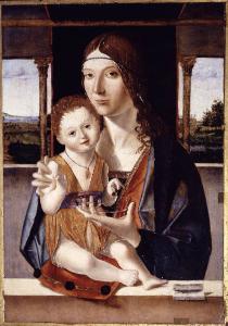 - NOTIZIE STORICO CRITICHE Dall'indagine riflettografica del 1997 (Maria Clelia Galassi, Università di Udine) si evidenziano pentimenti nel volto della Madonna, del bambino nella zona del naso e nella mano destra della Vergine. Fin dallo studio di R. Longhi nel 1953 la critica riconosce nell'opera una derivazione da un'opera perduta del padre Antonello da Messina. Al verso è presente un'iscrizione ottocentesca indecifrabile.