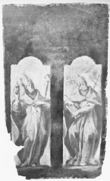 Su finte mensole architettoniche, entro incorniciature verticali, polilobate al margine superiore, con fondo di cielo: a sinistra SantìAgostino, che regge nella mano destra un cuore fiammeggiante, e ha in capo la mitra vescovile); a destra un Santo Papa, San Gregorio Magno, con un libro fra le mani, accompagnato dalla colomba dello Spirito Santo.