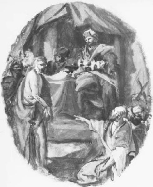 A sinistra Gesù Cristo, che viene presentato a Pilato, seduto in trono, a destra, in secondo piano, sotto una tenda drappeggiata; tra i personaggi presenti un anziano, nell'angolo inferiore destro, addita il Cristo; entro un ovato.