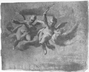 Due angioletti in volo, posati su nubi, uno reggente un ramoscello.