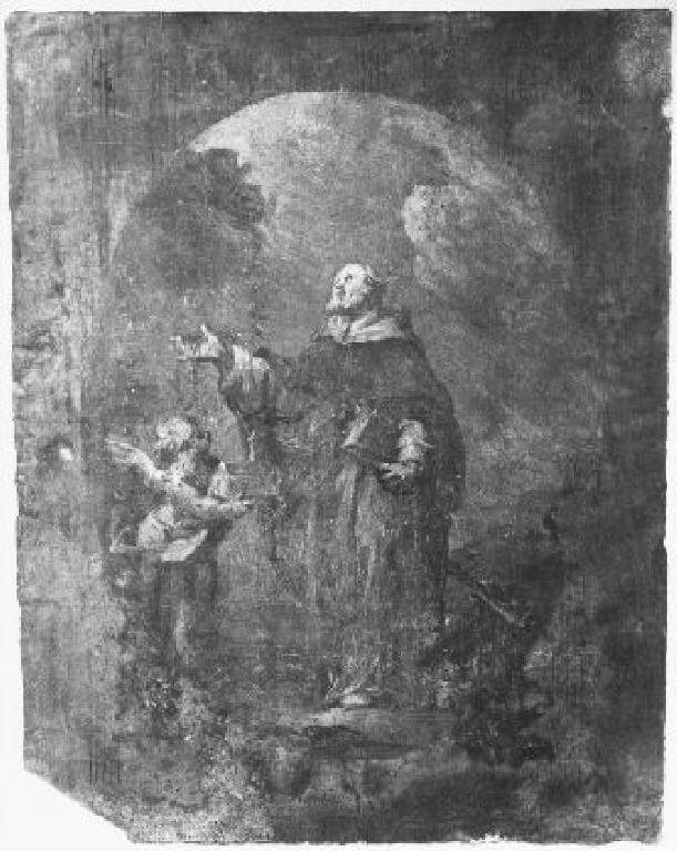 San Domenico in piedi, volto di tre quarti a sinistra, con lo sguardo levato al cielo, tiene nella mano destra la corona del Rosario e nella sinistra un libro; accanto a lui un angelo gli presenta il modellino di una chiesa; sul fondo di intravedono alberi e nuvole; entro un ovato.